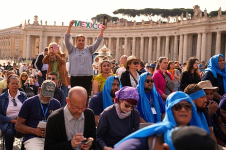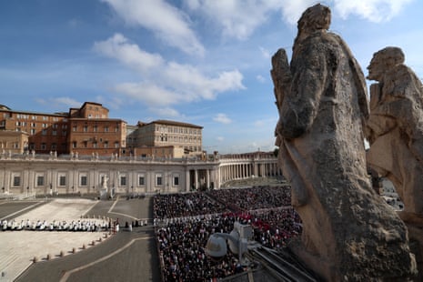 The trustworthy collect in St. Peter’s Sq. as members of the clergy stroll to St. Peter’s Basilica on the day of the interpretation of Pope Francis’ physique and its switch to the basilica. {Photograph}: Claudia Greco/Reuters