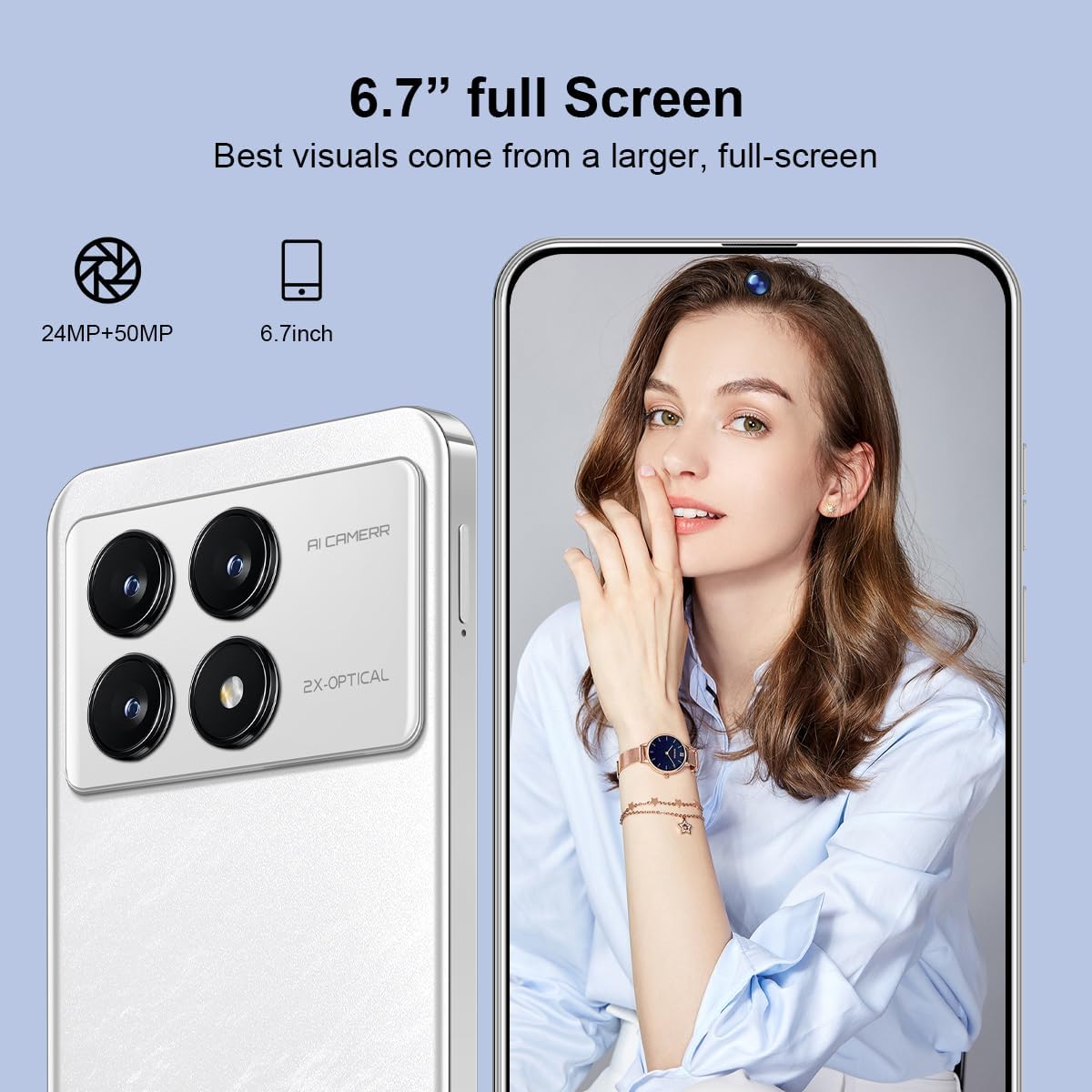 7 reviews for K70 Unlocked Cell Phones 5G 2024 Android 13 Android Phones 8GB+256GB/8-Core Mobile Phones 6.7″ HD Screen 24MP+50MP Camera 6200mAh Battery Standby 5G Dual SIM Smartphones(White)