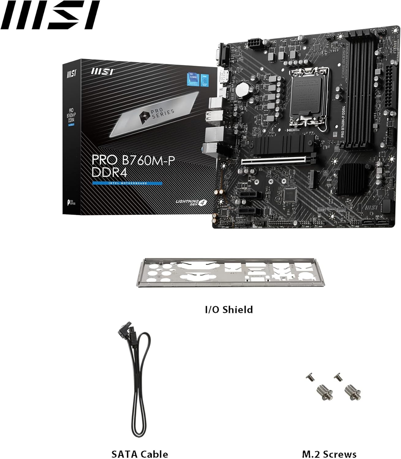 MSI PRO B760M-P DDR4 mATX Motherboard, 4X DDR4~128GB, 1x PCI-E x 16, 2X PCI-E x 1, 2X M.2, 4X SATA, 1x USB 3.2, 4X USB 2.0, 1x USB-C