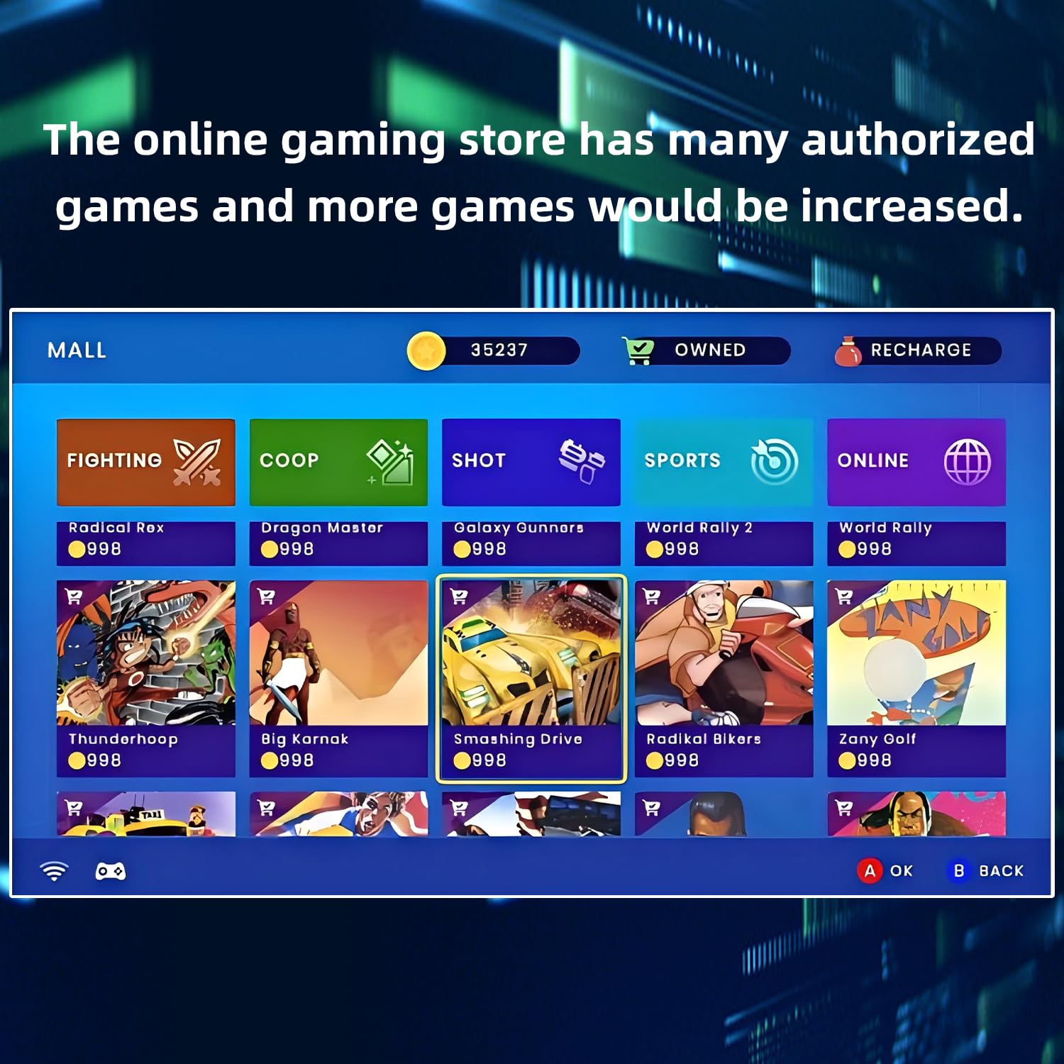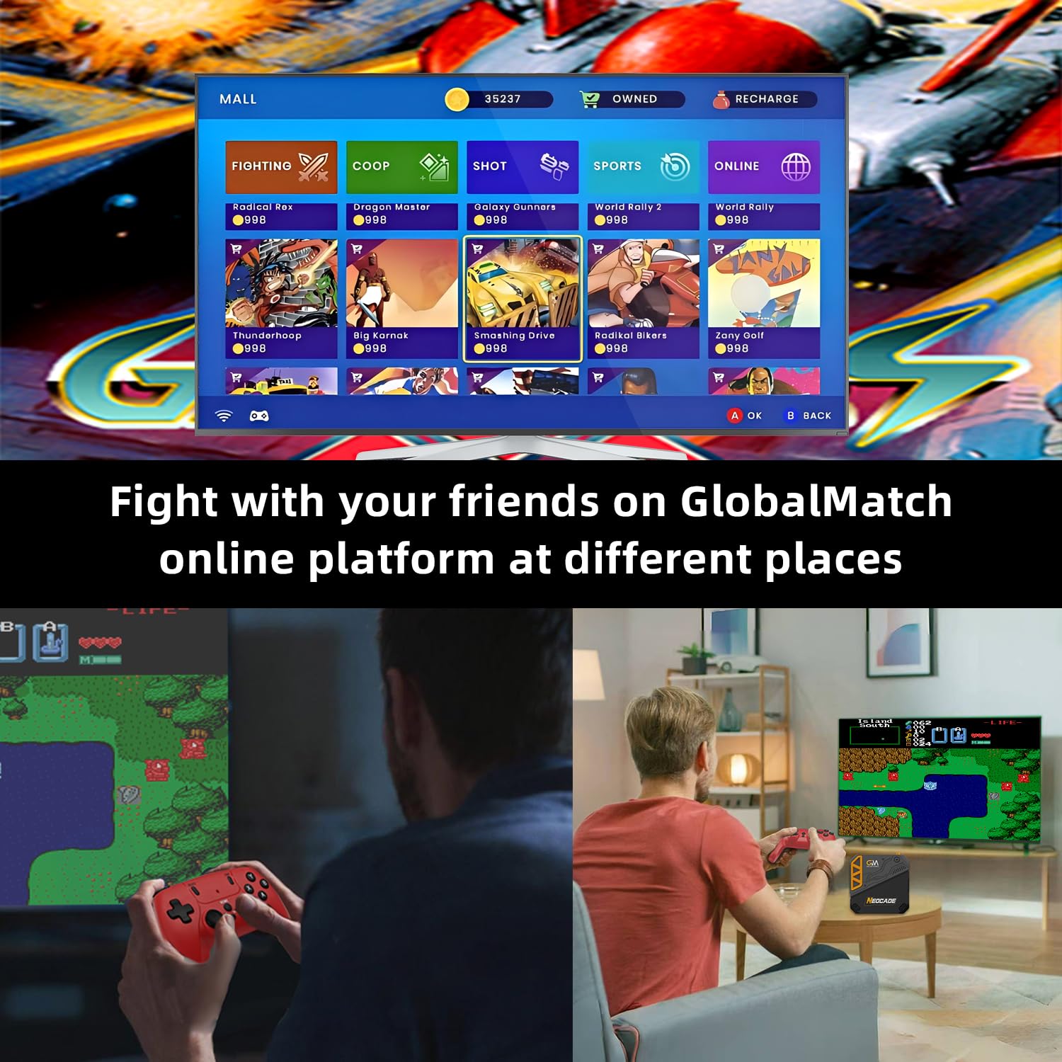 [Kind Notice]: 1. This is a classic retro game console from the 1980s and 1990s, the image quality will not be as clear as today’s games on the big screen. 2. The GlobalMatch is a new online gaming platform, there may only few game players on gaming rooms. 3. If you could not add more games, please contact us, we will help you solve. 4. wireless controllers require extra batteries, not included in the package.