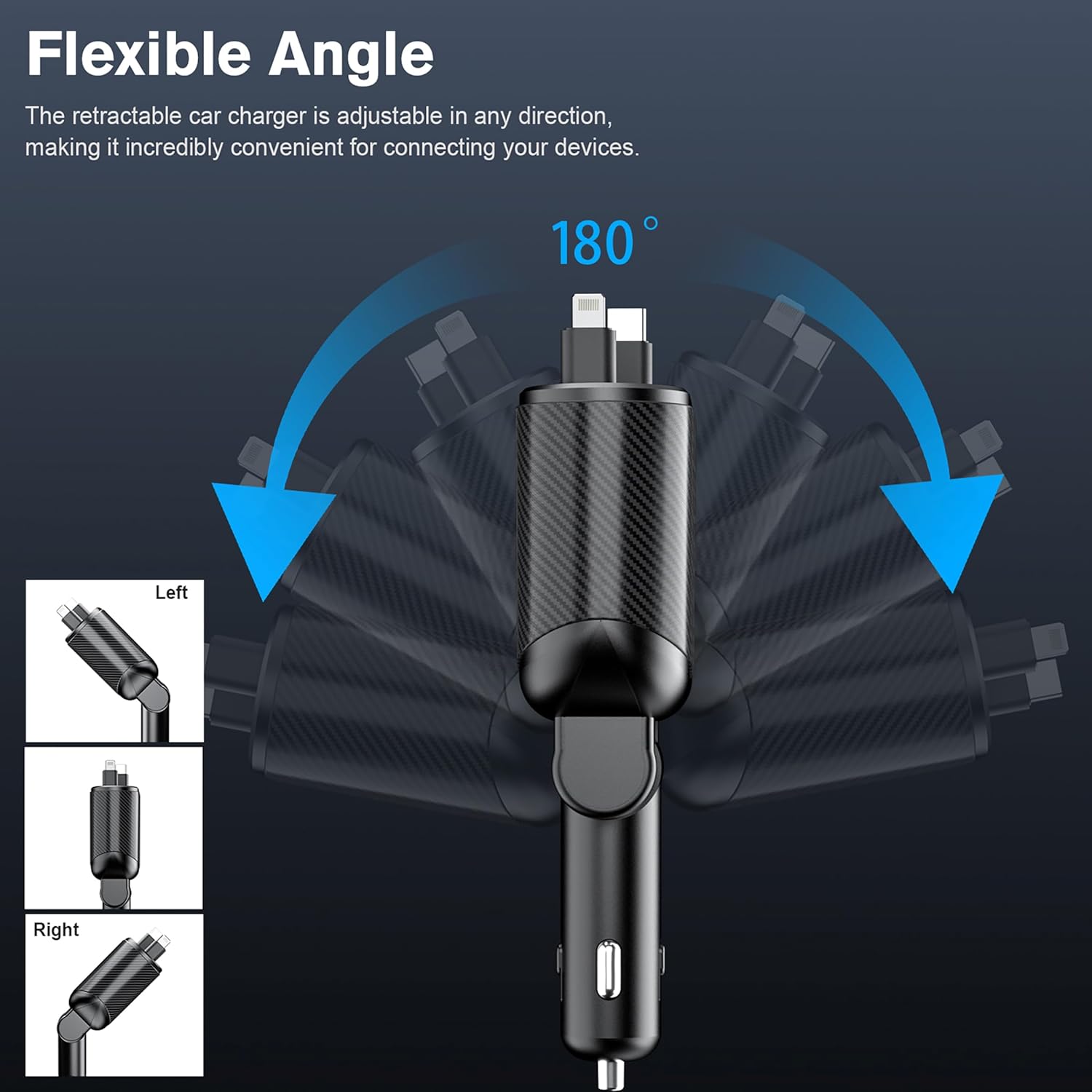 This retractable car charger is a game-changer for anyone juggling multiple devices during road trips or commutes. Its dual retractable cables for USB-C and iOS devices make it incredibly convenient – no more tangled wires or forgotten chargers. Simply pull out the length you need, and the cables neatly retract when youâre done, keeping your car interior tidy.What really sets this charger apart is its power. With an impressive 80W output and multiple ports, it can handle fast charging for everything from your iPhone or Android phone to larger devices like tablets and laptops. Whether you’re running errands or heading on a long journey, this charger ensures your gadgets are always ready to go without delay.Safety and durability are also key highlights. Built with sturdy aluminium and ABS materials, itâs designed to withstand regular use. Its integrated safety features protect your devices from overheating, overcharging, or short circuits, giving you peace of mind during every drive.This chargerâs compatibility is nearly unmatched. From 12V sedans to 24V trucks, it fits perfectly, and the flexible swivel plug ensures easy access no matter where your carâs outlet is located. Add in its stable performance on bumpy roads, and youâve got a reliable companion for all your charging needs.For anyone looking to streamline their in-car charging experience, this charger is a smart and practical investment.