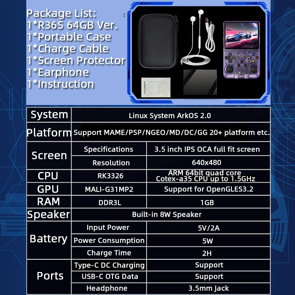 Package Including: 1xR36S Console Purple Transparent, 1xUSB-C Charge Cable, 1xScreen Protector, 1xInstruction, 1xEarphone by CredevZone.