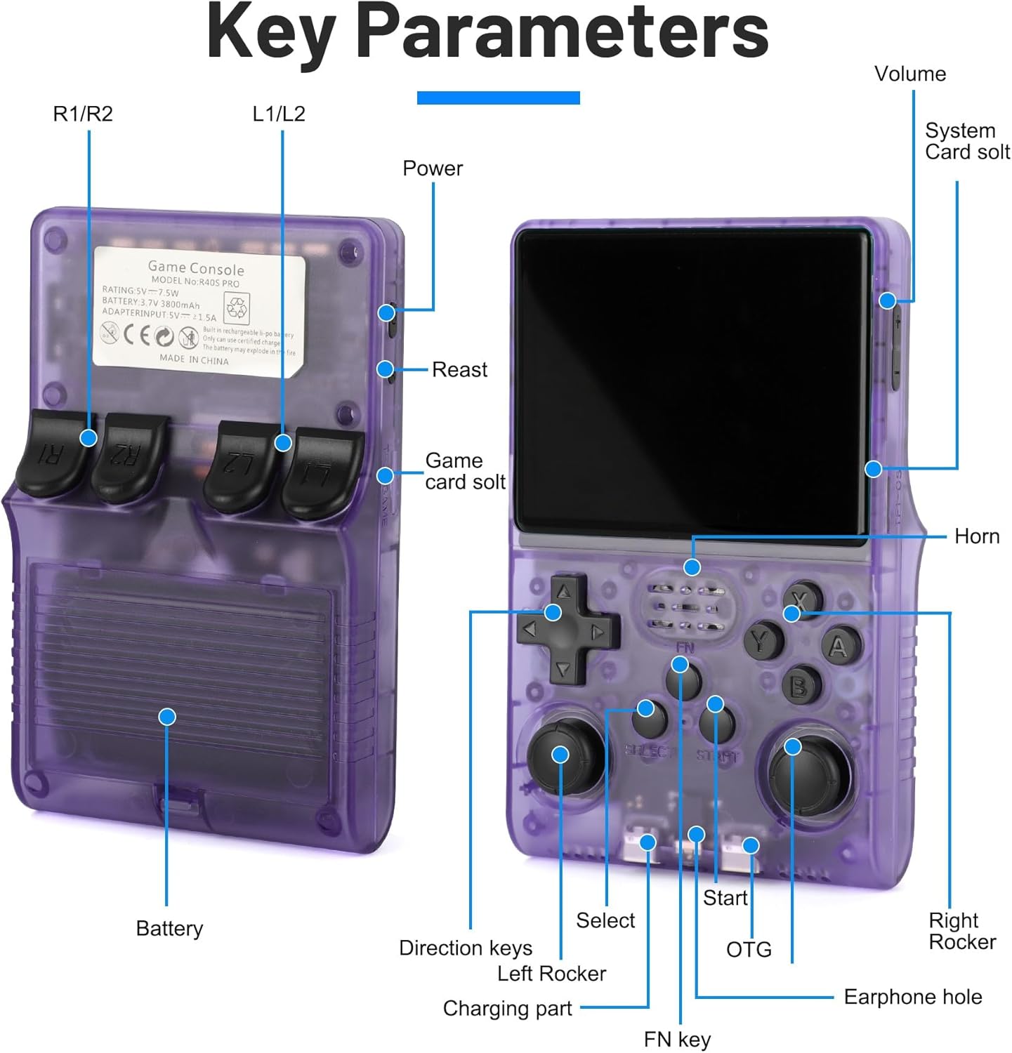 The R40S PRO is a great hand held retro console. It comes packed with games from many different retro consoles and runs very smoothly.The large IPS screen comes with bright and vivid colors, making the screen crystal clear when playing. The speaker on the console is loud and clear making gameplay enjoyable. The buttons and joysticks are great and sturdy, as well as the battery life, making you able to play for the whole day. The console charges with a usb-c charger cable making charging hassle free.It has 2 SD card slots and comes with a 256GB SD card (OS/EmulStation and already 81.5 GB of games). The console runs EmulStation on Linux Ark OS v2, you can download new roms (games) from your computer into the SD card to play them on the console.Overall, this console is great for road trips and at home. Its smooth gameplay and large colorful screen make gaming very enjoyable.
