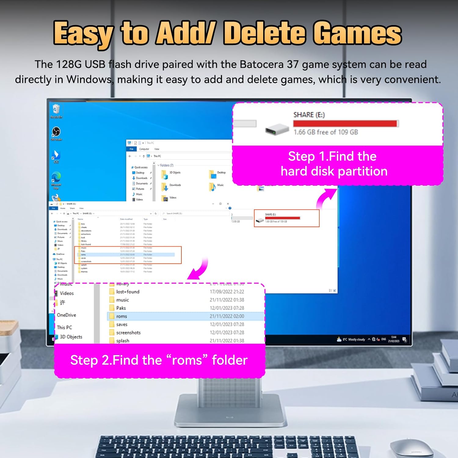 Easily manage games on your mini game console directly from Windows. Navigate to your hard disk partition and locate the “roms” folder for effortless game additions and deletions.