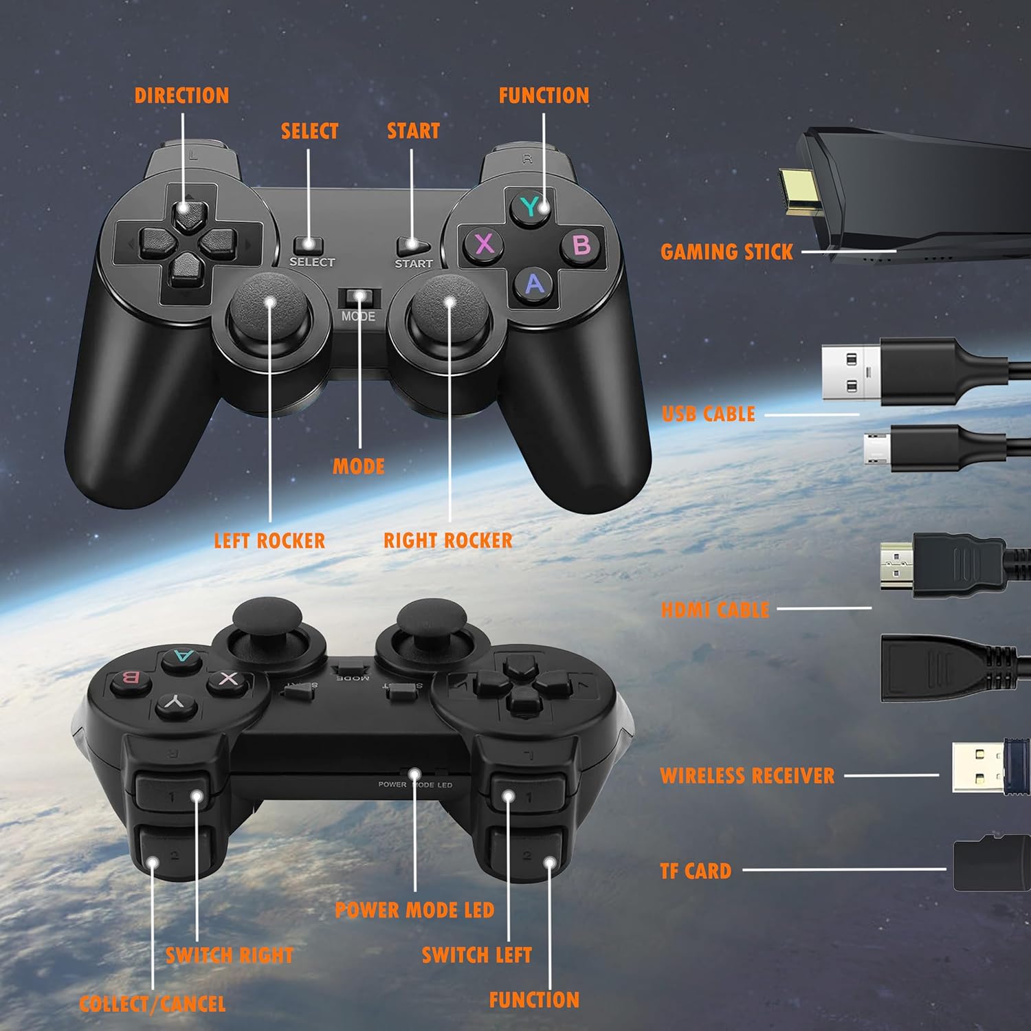 【Simple operation just as 1-2-3】Connect the HD output to the TV, plug in the built-in TF game content card, and then connect to the power supply using the charging adapter. Note that the controller requires 4 AAA batteries (note: Charging adapters and batteries are not included in the package).