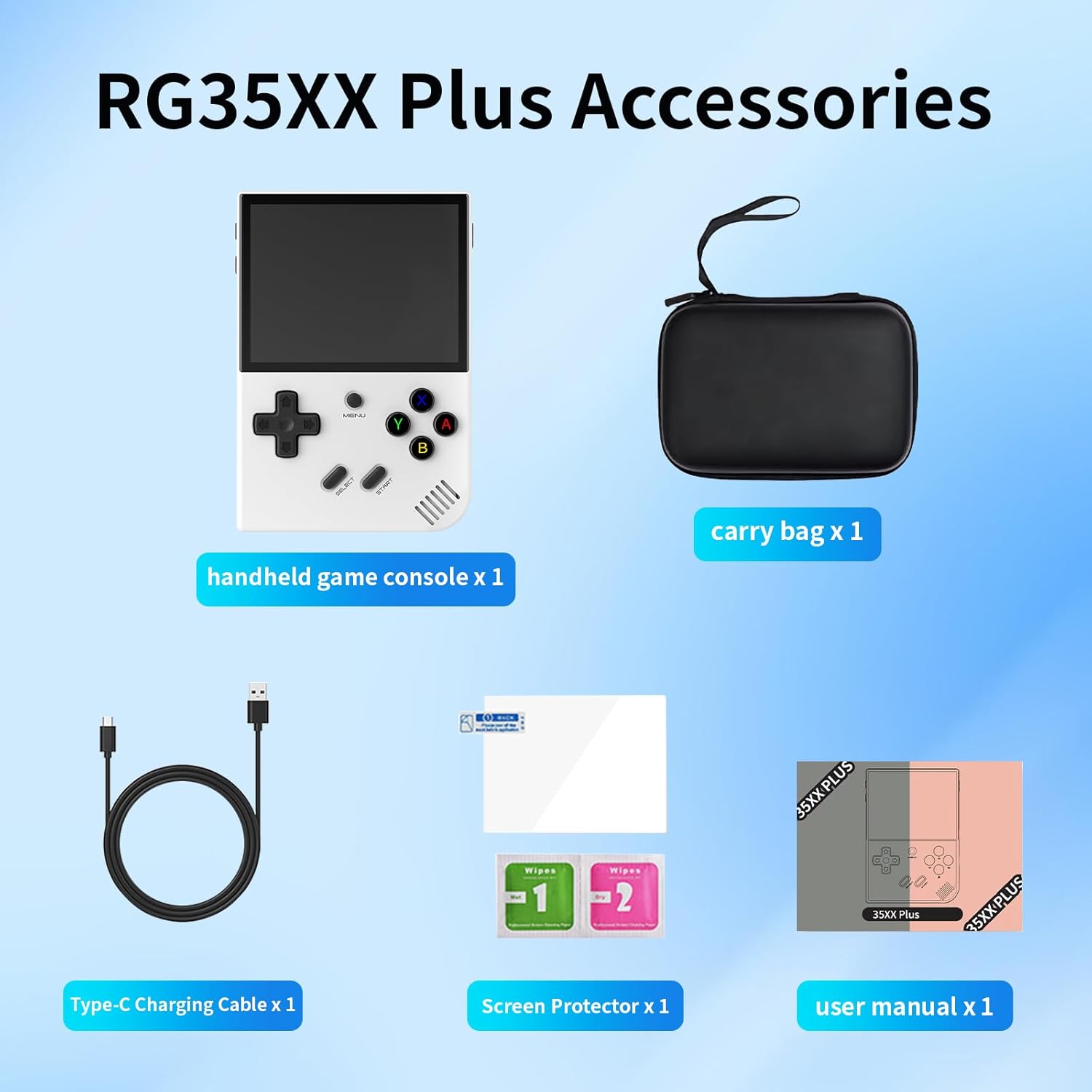 【What You’ll Get】1x RG35XX Plus Handheld Game Console,1x 64G TF Card,1x USB-C Charging Cable,1x Screen Protector,1x Carry bag,1x User Manual