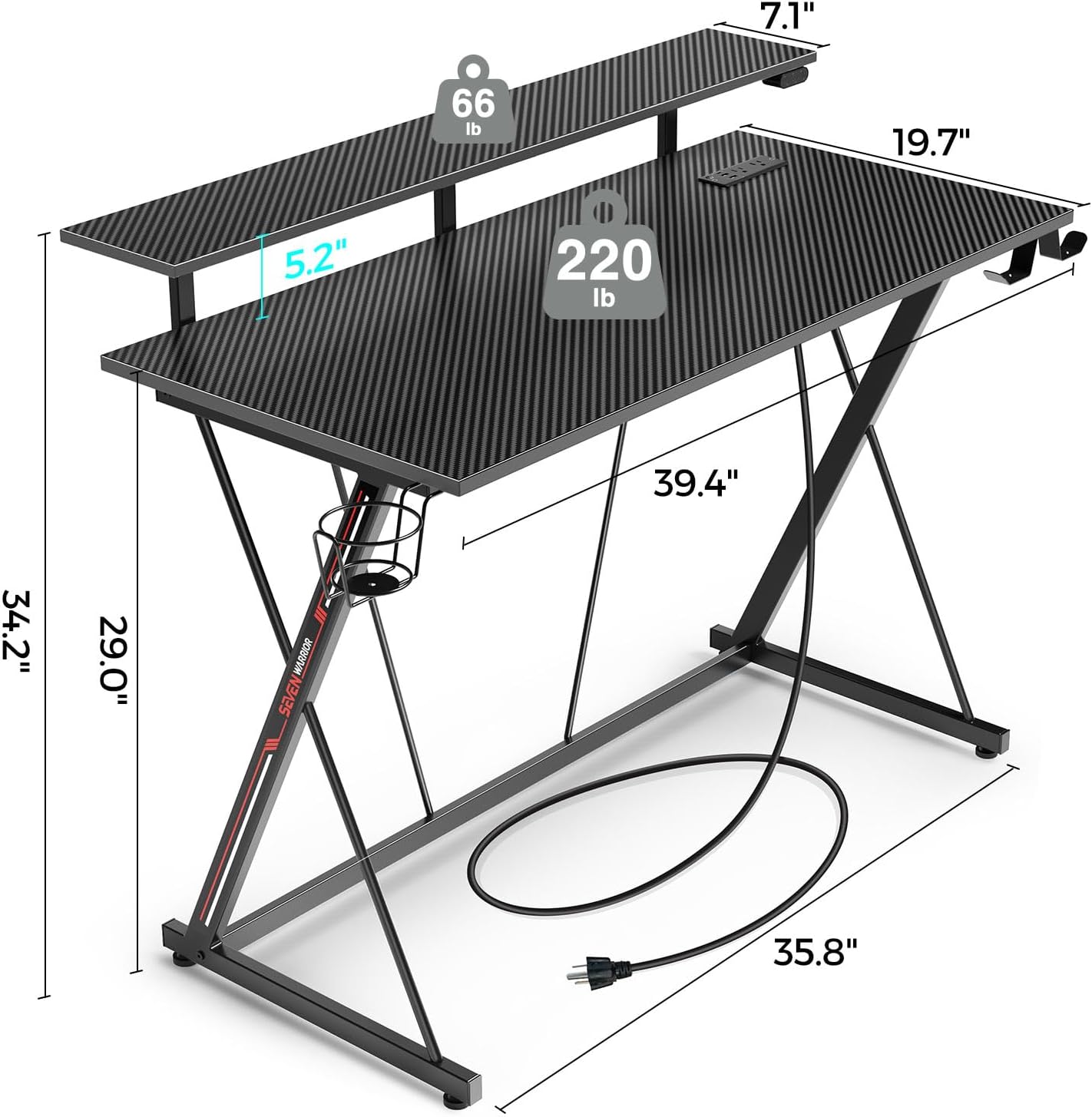 13 reviews for SEVEN WARRIOR Gaming Desk with LED Lights & Power Outlets, 39.4″ Computer Desk with Monitor Shelf, Home Office Desk with Cup Holder and Headphone Hook, Ergonomic, Carbon Fiber Surface Black