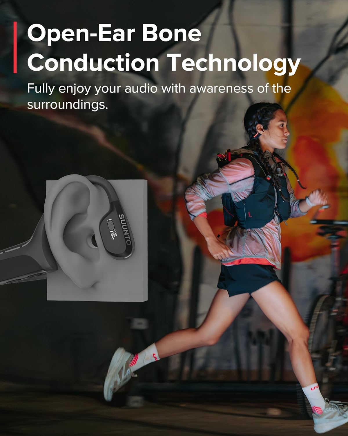 SUUNTO Wing Open-Ear Bone Conduction Headphone, Bluetooth Multipoint Pairing Headset w/Head Movement Control, 10H Battery Life, Fast Charging, IP67 Water-Resistant & Safety Lights for Workouts, Black